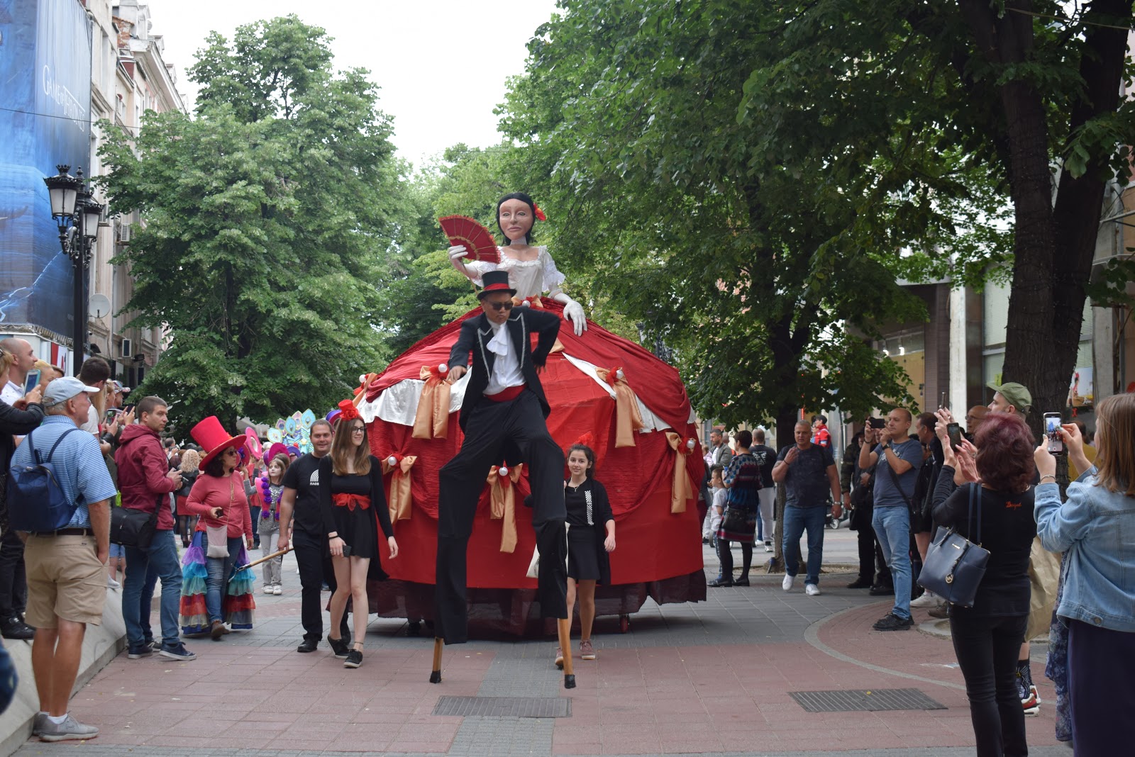 The viewers' attention was pinned to the parade, which included actors on stilts, fish and frogs, Asian masks, huge birds and horses; There were also members of the Gabrovo car naval "MASKS UP!" who participated with sculptures of the Sun, Moon and Fire and invited the Plovdiv citizens to visit their show in Gabrovo on 18th May .